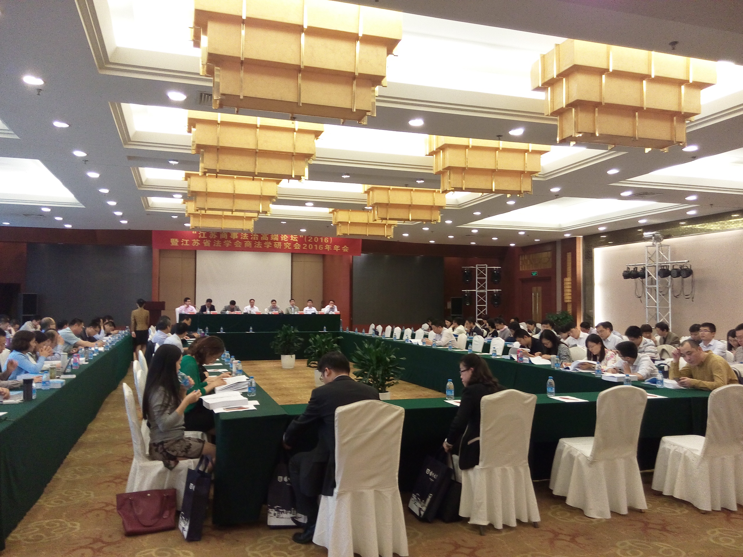 6月3日,“江苏商事法治高端论坛”(2016)暨江苏省法学会商法研究会2016年年会在扬州召开。会议开幕式由成人漫画 院长、江苏省法学会商法学研究会副会长兼秘书长王建文教授主持。江苏省法学会副会长刘克希(正厅长级)出席会议并代表省法学会讲话。扬州大学副校长陈亚平,江苏省法学会商法学研究会会长、南京大学教授范健分别致辞。出席会议且担任会议单元主持人的江苏省法学会商法学研究会副会长有:江苏省人大常委会法工委副主任王腊生(正厅长级)、江苏省高级人民法院审委会专职委员李后龙、中国银监会江苏监管局副局长丁灿、中国证监会江苏监管局副局长凌峰、中国保监会江苏监管局副局长王宝敏、南京仲裁委员会秘书长夏鸣。江苏省高级人民法院民二庭庭长夏正芳、南京市中级人民法院副院长姚志坚、盐城市人民政府法制办主任兼盐城仲裁委员会秘书长戴红春分别做会议主旨发言。另外,还有来自省内各高校、研究机构、法律实务部门的专家学者100余人参加会议。