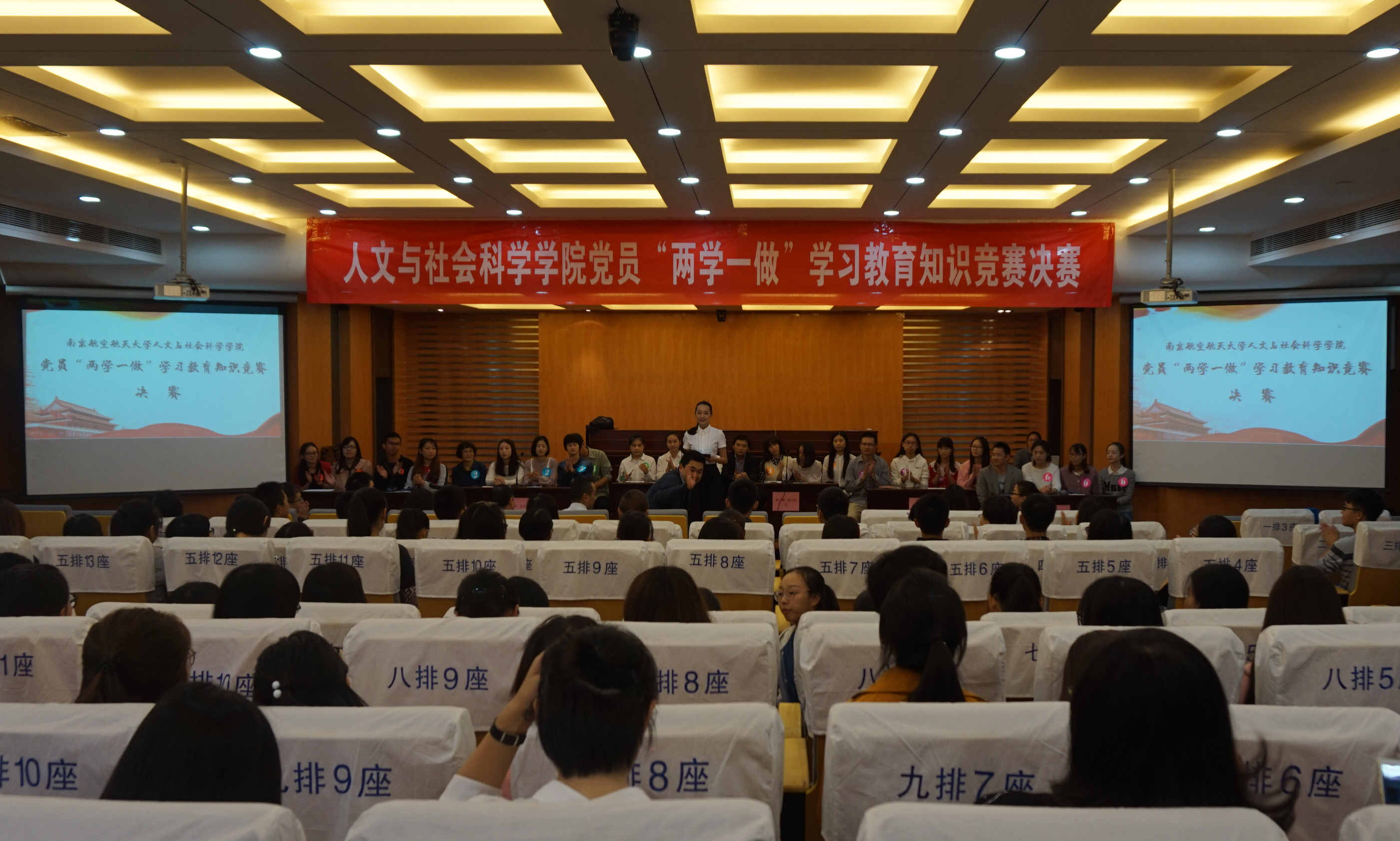 除了场上的激烈角逐,台下观众也积极融入学习竞赛氛围,纷纷参与互动环节,展现了人文学院师生热情的学习态度和扎实的理论功底;比赛中当题目涉及入党誓词时,主持人也号召全场师生起立共同重温誓言,一字一句更加坚定了大家不忘初心、牢记职责的使命,践行对党的庄严承诺。