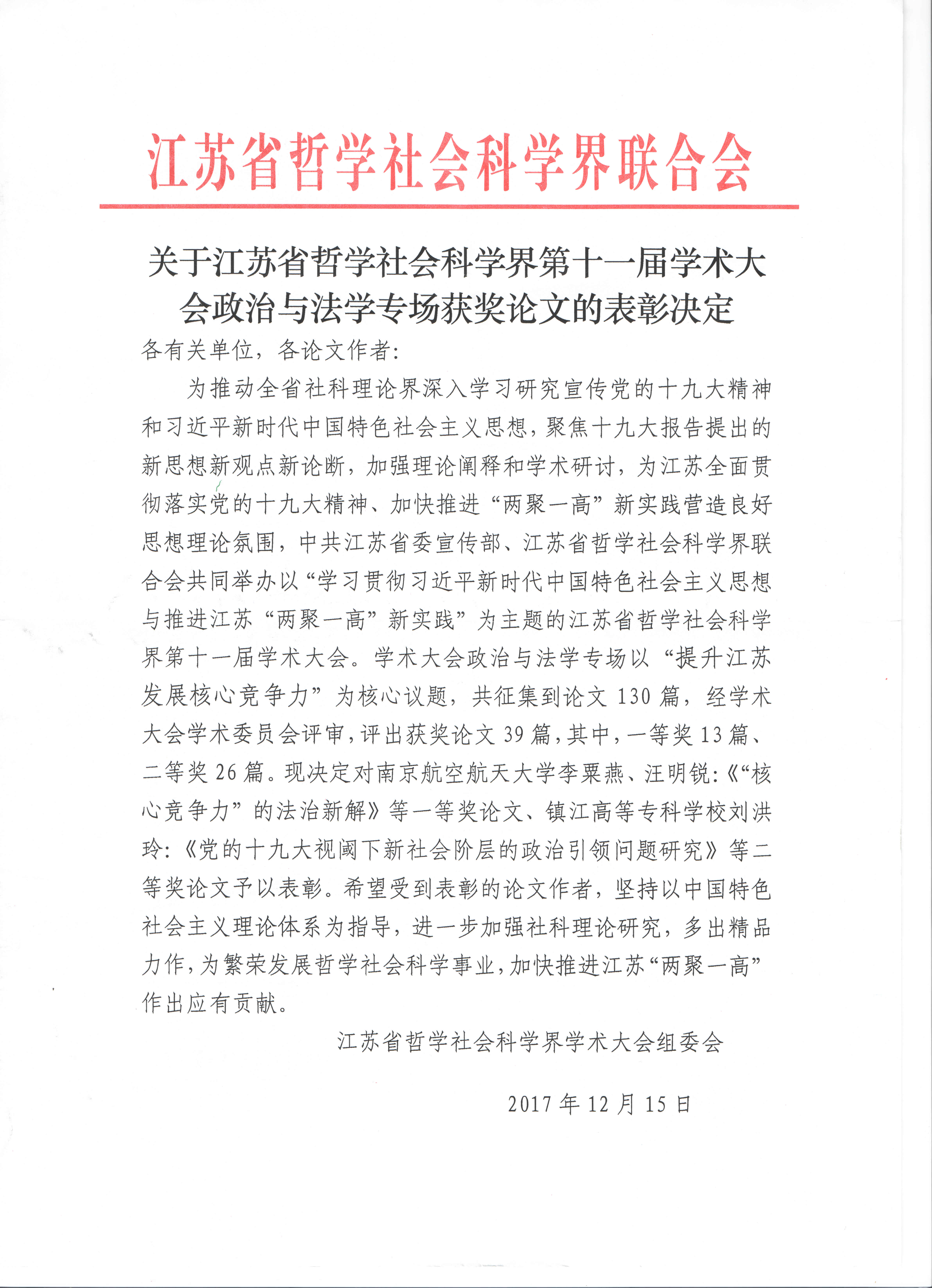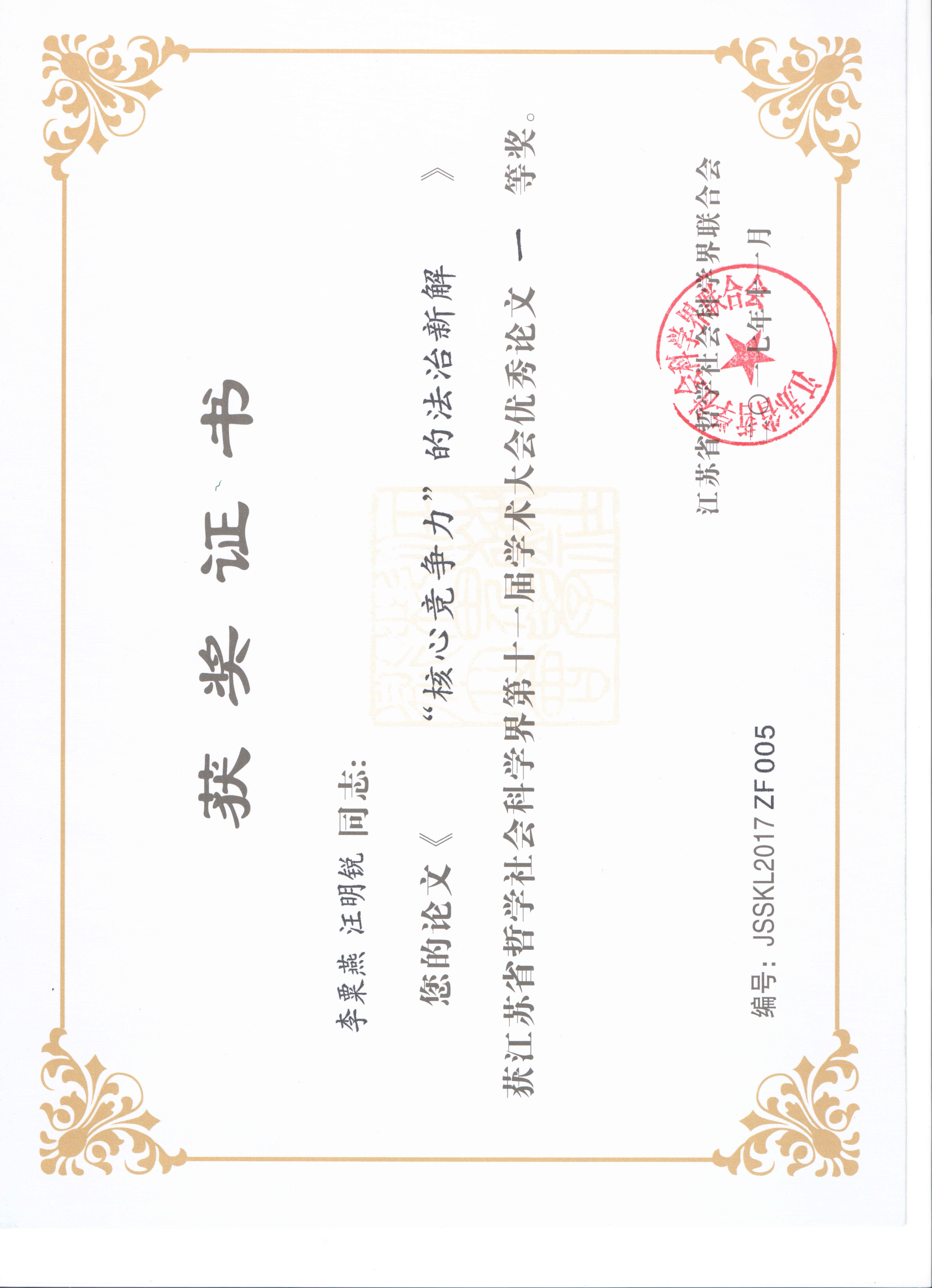 江苏省哲学社会科学界第十一届学术大会政治与法学专场的主题是“提升江苏发展核心竞争力”,来自省内外高校、党校、科研机构和法律实务界的代表100多人参加了政治与法学专场的会议,围绕这一主题展开热烈研讨。本次会议共征集论文130余篇,经学术委员会评审,评出获奖论文39篇,成人漫画 李栗燕教授与其研究生汪明锐同学合作的论文《“核心竞争力”的法治新解》荣获江苏省哲学社会科学界第十一届学术大会优秀论文一等奖,李栗燕教授应邀参加会议并在法学专场作了大会发言。