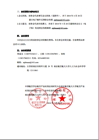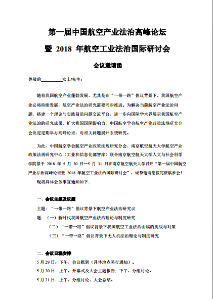 第一届中国航空产业法治高峰论坛暨 2018 年航空工业法治国际研讨会会议邀请函