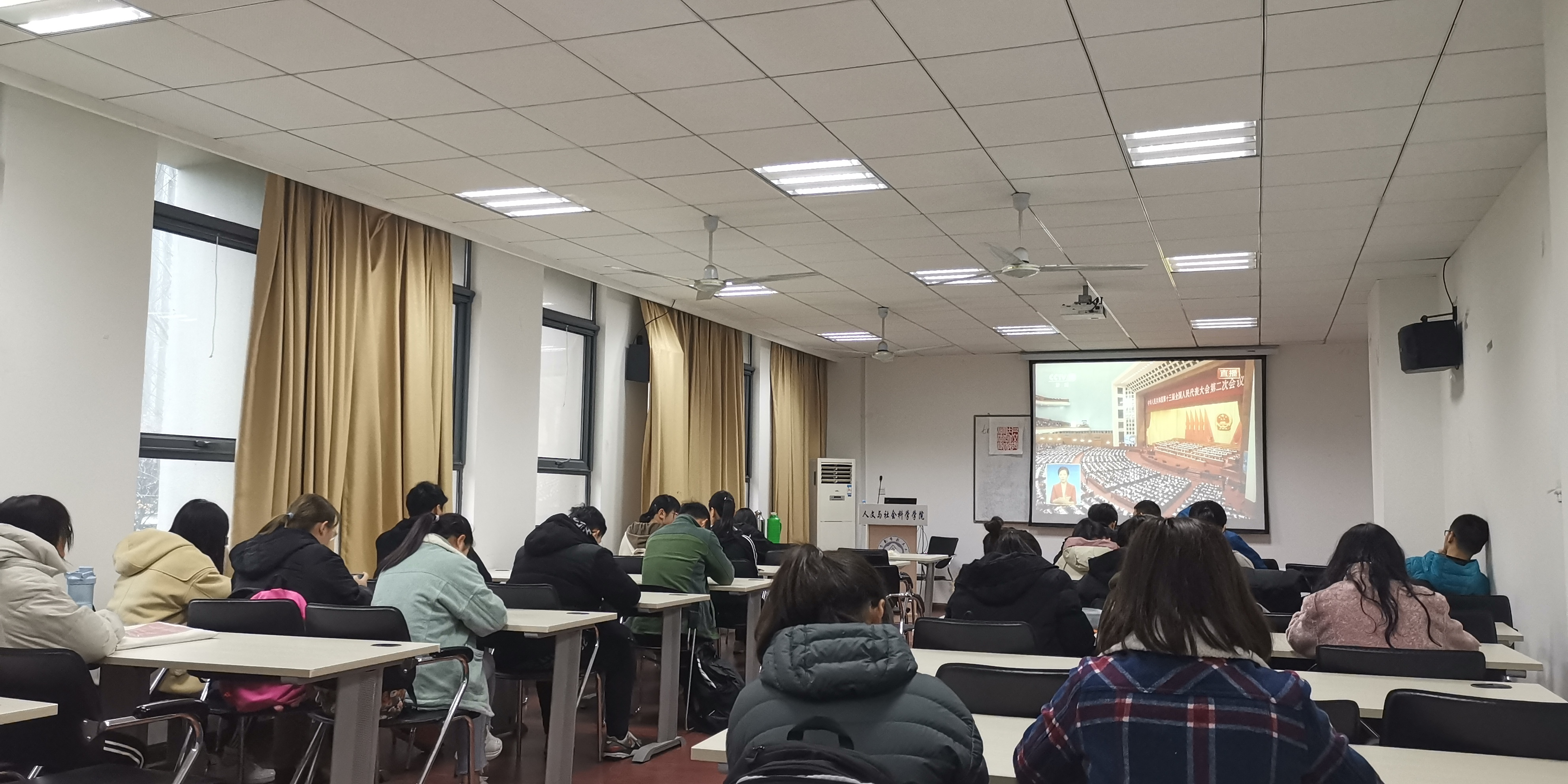 2019年3月5日上午9点,成人漫画 组织教职工和学生分别在学院312、210会议室集体收看了第十三届全国人大二次会议开幕式的直播。未到现场的师生也纷纷通过网络与电视等渠道自行进行了观看。