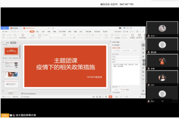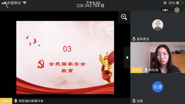 活动期间,各班以“云班会”的形式开展国家安全教育日主题活动。1019101支部以“新疆,守卫圣土”为主题,会上,班上两位新疆同学为同学们分享了护边员买买提努尔.吾不力艾山和尼勒克县乔尔玛烈士陵园守护人陈俊贵的故事,激发同学们的爱国情怀。1019201班举办“我国疫情下的相关政策措施”团日活动,政策虽大却不远,它指导着每个城市的复苏,同学们结合当今实事,关注疫情进展,深入浅出地探讨了疫情下息息相关的政策。1019301支部开展了“从抗击疫情视角下关注国家安全”主题班会。班会以本次新冠肺炎疫情为切入口,重点关注了国家安全中的生物安全。大家踊跃发言,积极地与同学分享对于生物安全和总体国家安全观等学习内容的看法与自己的理解。