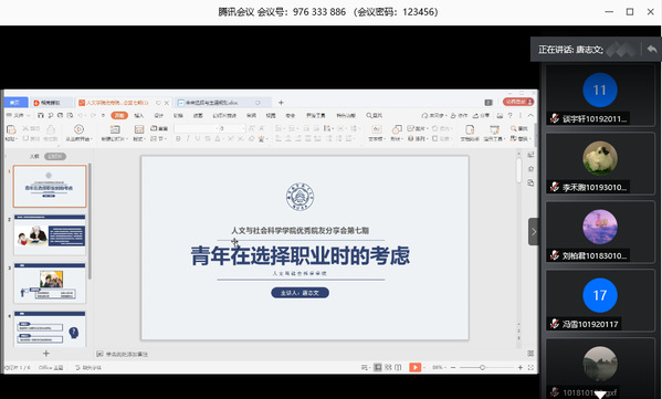2012届思想政治教育专业优秀硕士毕业生,现任南航校团委办公室主任,他从事多年学生思想政治教育工作、学生培养工作,有着丰富的学生工作经验。本期分享会,唐老师以“青年在选择职业时的考虑”为主题,从“选择”的角度为同学们剖析青年在选择职业时应有的考量。