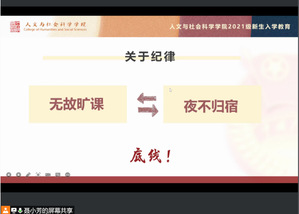 合格的大学生,在享受精彩丰富的大学生活同时,也有在大学中不能触碰的底线:夜不归宿、无故旷课等。本模块引导大一新生客观认识自我,充分了解学校各项规章制度,强调学生认真学习《学生手册》,让学生充分了解学校的规定办法。会议中穿插告诫学生年级事务注意事项、遇突发状况的处理方式等等,帮助学生拥有安心舒适的大学生活
