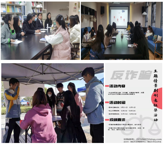 电信网络诈骗是我国近十几年来上升最快的一类违法犯罪活动,具有手段多样性、行为隐蔽性、犯罪的连续性、后果难以预测和不可控性等特点,其社会危害性远远大于普通诈骗。为进一步提高广大师生群体的防范意识,共同创造平安、和谐的校园环境,法律系党支部的党员教师带领本科生党支部、大学生法律援助中心的部分同学,精心设计了一系列活动,让同学们从了解网络诈骗、分析具体类型的诈骗到熟悉各种电信网络诈骗形式,最终树立反诈意识,并向身边的同学、家人宣传电信网络诈骗风险,帮助同学和家人识别、抵制电信网络诈骗。