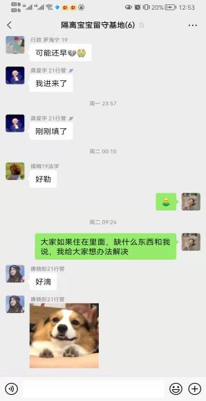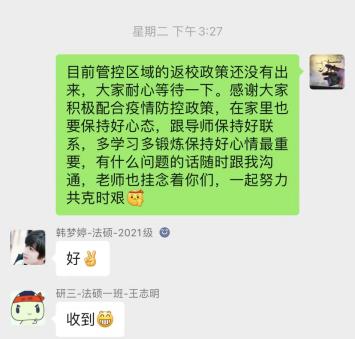 根据疫情发展变化,学院每天认真更新、排查因疫情滞留中高风险、管控地区的学生情况,第一时间与滞留学生一一取得联系,做好学生们的心理疏导与学业帮扶。对于在校内隔离的学生,辅导员们关注实际需求,及时送去慰问与关怀。