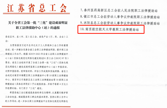 南航法律援助的公益活动得到了新华网、江苏电视台、腾讯网等多家媒体报道,收到被援助人的感谢信20余封,锦旗10余面,多次获得优秀服务团队等荣誉称号,赢得了社会各界的赞誉。2020年,南航教职工法律援助中心被江苏省总工会授予“职工法律援助站”称号,成为全省唯一获此殊荣的高校法律援助中心。