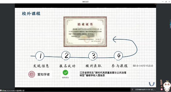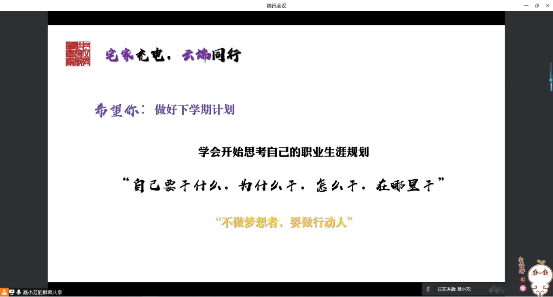 会上,聂小芳为大家分析了理性认识疫情与科学防护的必要性。在了解到部分同学对当下疫情情况的担心与焦虑后,聂小芳通过分享钟南山院士讲座内容为同学们提出了许多切实的建议。她鼓励大家要掌握科学的防护知识,理性认识疫情形势,在家也不能忘记“充电”,积极通过阅读、锻炼等方式让自己“忙起来”,并认真为下半学期做好规划。