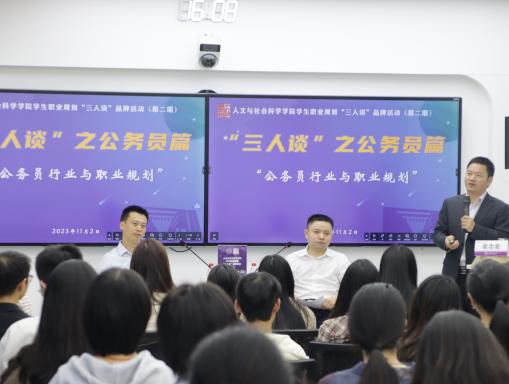 11月2日,成人漫画 在院楼213智慧教室举办“三人谈”品牌活动(第二期)——“公务员篇”,院长高志宏、两位在职公务员共同与同学们探讨“公务员行业与职业规划”。