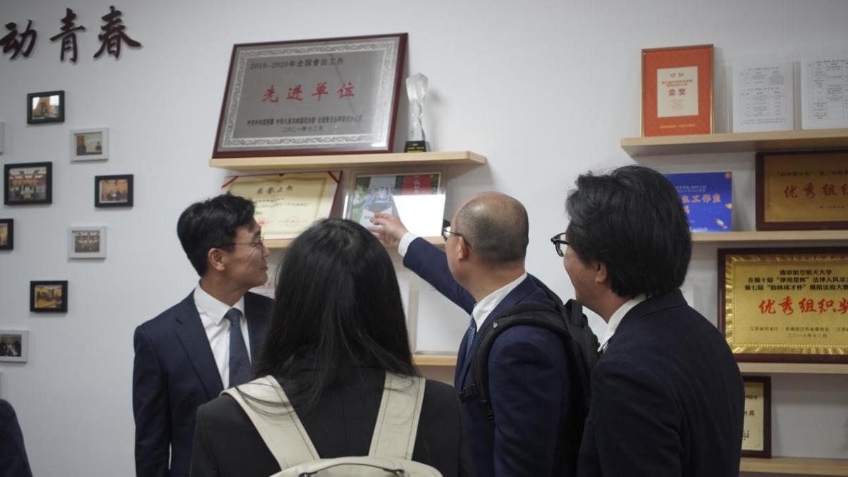 会前,郑镇根一行参观了学校御风园、校园法治文化馆及学院法律援助中心、模拟法庭等育人基地。