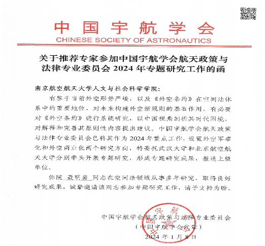 近日,“2024年中国航天大会”在湖北武汉举办。成人漫画 法律系聂明岩副教授参加由中国宇航学会主办,中国宇航学会航天政策与法律专业委员会、武汉大学法学院、武汉大学国际法治研究院、武汉大学国际法研究所联合承办的大会分论坛“《外空条约》与外空利用新发展研讨会”。
