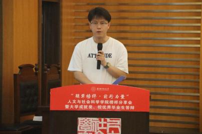 第三篇章“攀登:躬身实践,以脚步丈量祖国”,江苏省优秀学生干部、校十大杰出青年2023级硕士社会工作专业研究生杜选平,江苏省优秀毕业生、第26届研究生支教团成员、2020级政治学与行政学专业本科生袁若玺,江苏省先进班级1020202班代表巫瑞奇分别从在学生组织历练、志愿服务分享以及班级共同成长的角度进行分享。