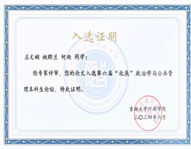 在成人漫画 公共管理系鲁兴虎老师的指导下,行政管理专业大三本科生姚郡兰、何雨同学的论文《社会资本、感知价值与居民参与改造意愿——基于南京市老旧小区579份居民的调研数据》成功入选本年度论坛,姚郡兰同学受邀参会并做论文报告。