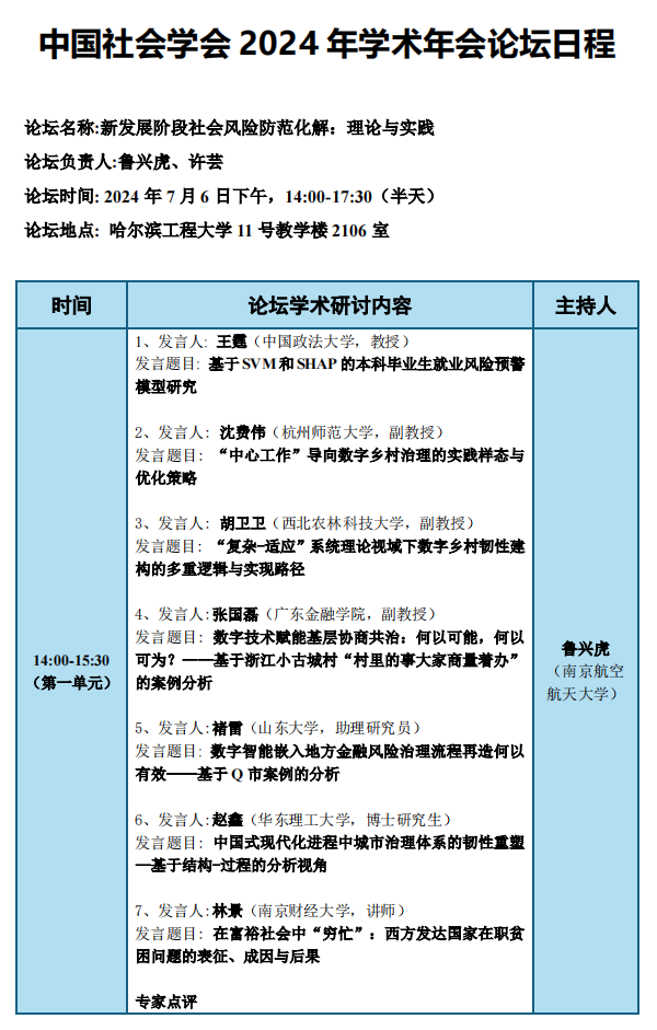 7月5日至7日,中国社会学会2024年学术年会在哈尔滨工程大学隆重举行。本届年会围绕“全面深化改革与中国社会学新征程”的主题,致力于响应国家的发展战略,深入挖掘和讨论中国式现代化的理论与实践问题。在这一学术盛宴中,由成人漫画 牵头,与南京财经大学法学院共同承办了主题为“新发展阶段社会风险防范化解:理论与实践”的分论坛,吸引了来自中国科学技术大学、山东大学、西北农林科技大学、中国政法大学、华东理工大学、河海大学、杭州师范大学、广东金融学院、南京财经大学和成人漫画 等全国知名高校和科研院所的30余名专家学者和硕博研究生的参与。