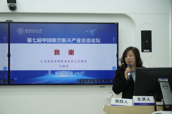 江苏昊程昊律师事务所王丽华主任在研讨会致谢环节向参会专家表达感谢,并表明未来会与人文学院携手,助力航空航天法治事业发展。