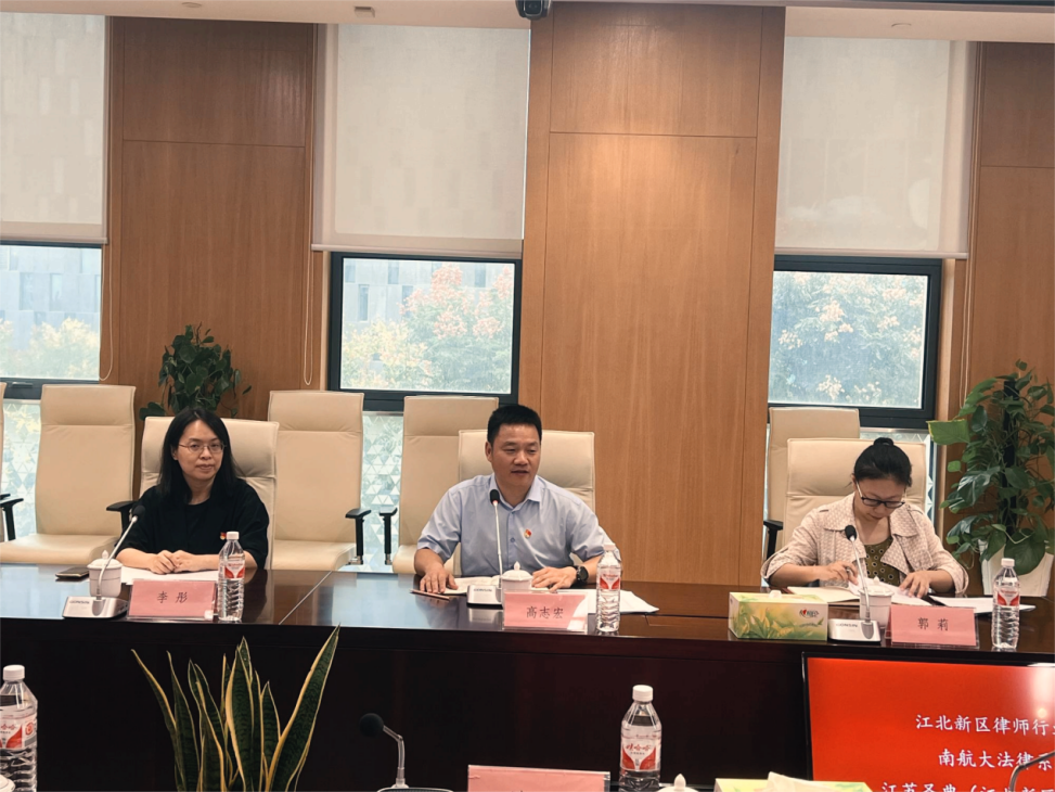 在座谈交流环节,陈宇对江北新区和南京自贸片区的发展情况进行了详细的介绍,强调了江北新区的“法治先行”理念,介绍了江北新区扬子江国际法务区的规划,江北新区法学培训人才研究基地的建设,对江北新区和高校的合作提出了展望。高志宏介绍了南航的“四次跨越”,南航人文学院的“精品文科”“特色文科”的定位以及南航法学的发展和对外合作,提出了党建引领,以活动为抓手,以成效为导向的发展计划和目标。舒群介绍了律所的发展情况及实践教学规划,并表达了与南航法律系进一步合作的期望。李彤对后续人才培养、基地建设等合作事宜发表意见,提出了“四共并进”的深度合作共建模式,从理论研究、案例分析、教学活动、学生指导等方面勤抓落实。