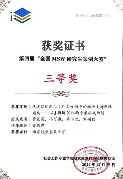 在总决赛中,成人漫画 团队凭借扎实的社会工作实践分析和创新的介入策略,最终斩获了大赛三等奖。该团队由23级社会工作专业黄星晨、冯可盈以及24级社会工作专业周小欣、刘硕程组成,在团队成员的共同努力下,团队不仅展示了对外卖女骑手群体需求的深入理解,还提出了可操作的社会支持网络建构方案,为外卖女骑手的社会支持提供了新思路。