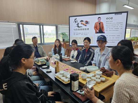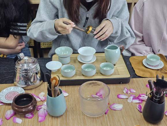 活动中,每位同学都亲手体验泡茶、品茶的过程,在体验茶艺的同时也放松了身心。