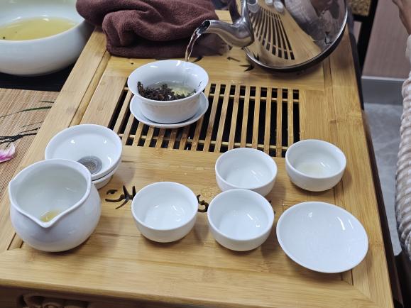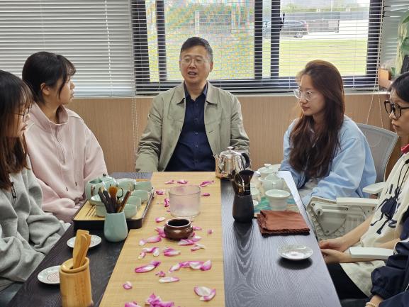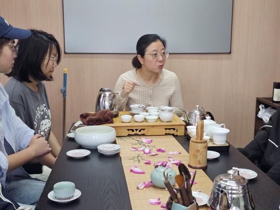 活动伊始,大家共布茶桌、展茶席、摆茶具、撒花瓣,开启品茶学习之旅。戴传江从茶的种类、产地、生长环境、炒制工艺等方面为同学们带来专业讲解,让大家对茶有了更深入的认识。顾芳芳现场教学,带领同学们学习泡茶、品茶,祁门红茶、金骏眉、岩茶、熟普洱茶纷纷登场,在大家在唇舌之间感受不同的茶香氤氲。