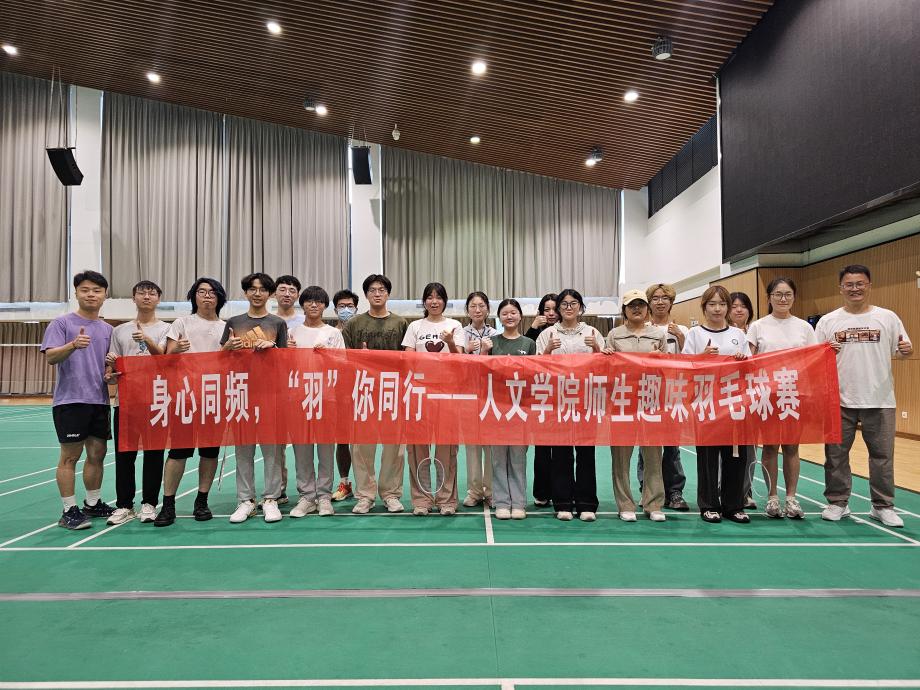 于天目湖校区风雨操场举办“身心同频,‘羽’你同行”——师生趣味羽毛球赛。行政管理专业教师田鹏、2024级本科生辅导员安洪文和2024级本科生代表20余人参加活动。