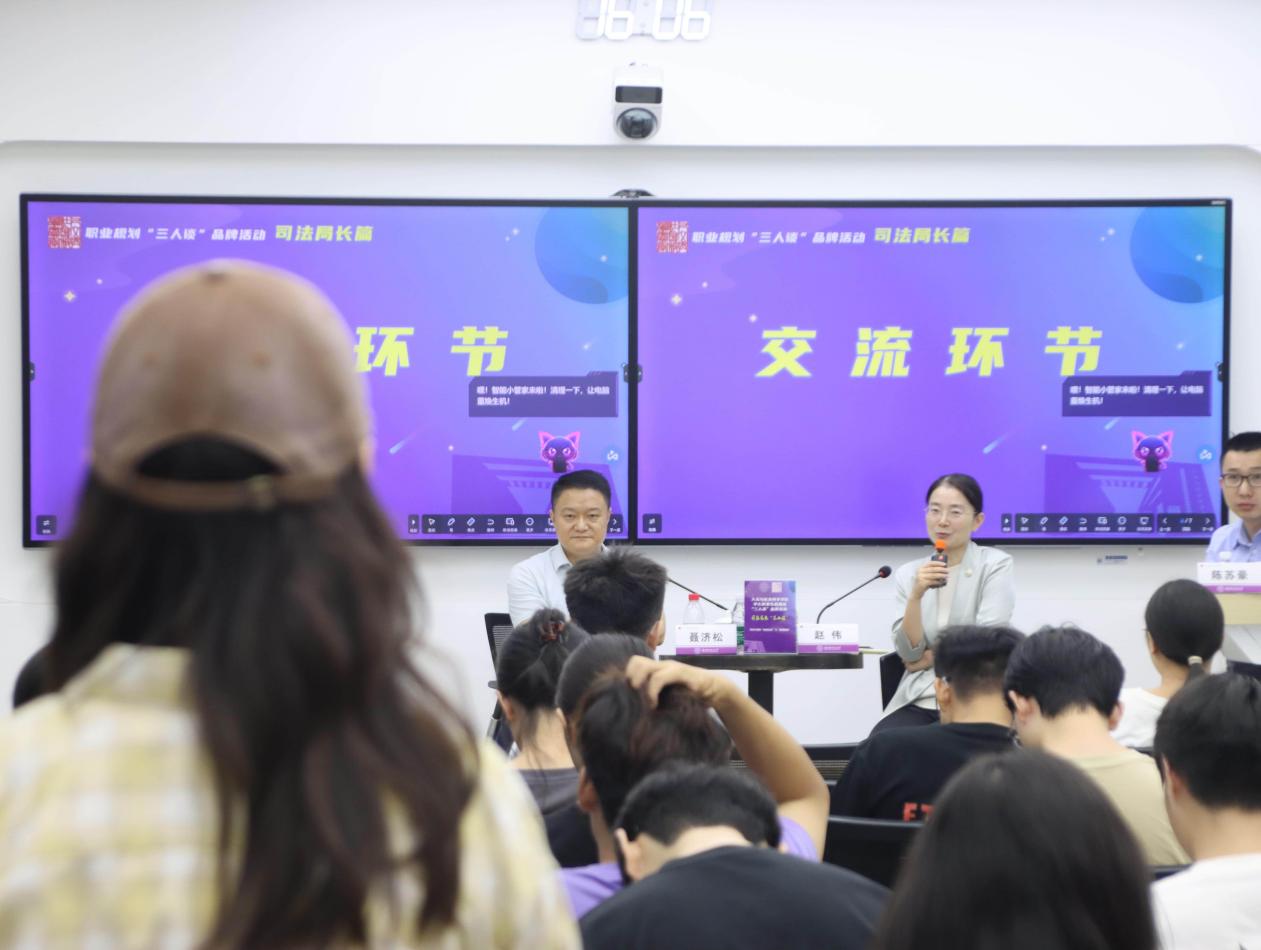在院楼213智慧教室开展职业规划“三人谈”品牌活动。南京市浦口区司法局党组书记聂济松、江宁区司法局副局长赵伟受邀到场,结合一线工作经验解读司法行政的“角色定位”与“机遇挑战”,并与同学们进行互动交流。活动由法律系副主任陈苏豪主持。