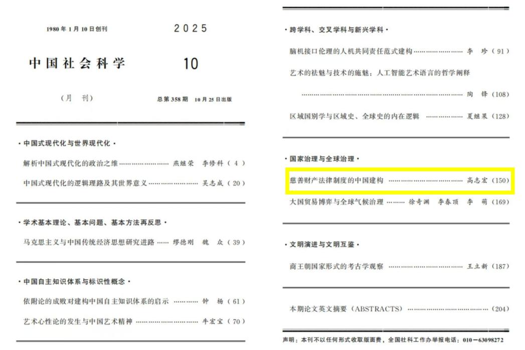 近日,成人漫画 院长高志宏教授的论文《慈善财产法律制度的中国建构》在人文社科领域顶级期刊《中国社会科学》2025年第10期正式发表。高志宏教授作为唯一作者刊发论文,是我校在法学研究领域的重要突破,进一步彰显了学校法学学科建设的显著进展与学术影响力。