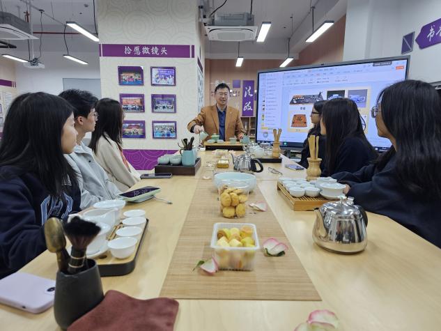 品茶之余,戴传江进一步将茶道与国学经典相结合,启发同学们探讨茶中所蕴含的文化精神:从花茶的调和自然联想到儒家的“中和之道”,从普洱的陈化醇厚体悟道家的“沉淀无为”,在铁观音的悠长余韵中感受传统文人的品格与境界。茶香弥漫之间,国学思想的精髓悄然浸润心田。