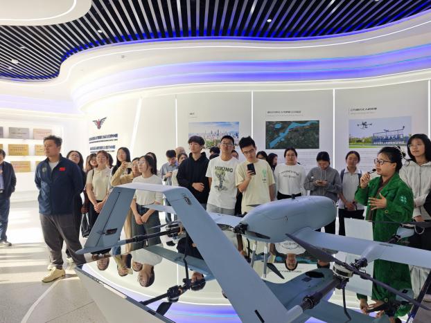 在产品展示区,师生实地参观南航自研锐鹰系列、飞龙FL300B集群式巡飞弹等多款无人机装备,深入了解不同机型的技术参数、核心优势,以及在长江大保护、海事应急、物流配送等场景的实战应用,直观感受无人机技术在社会治理、公共服务、生态保护中的重要价值。